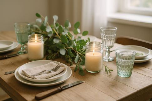 - Bougies maison : Faites fondre de la cire naturelle (soja, abeille), versez-la dans des verres ou pots que vous customisez aux couleurs de votre table (ruban, peinture, ficelle). Ajoutez une mèche – et le tour est joué.