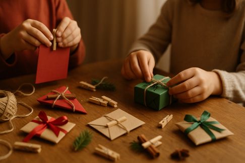 - Installation sur étagère ou niche : Disposez les éléments du calendrier (boîtes, maisons, sachets) en quinconce, en variant les hauteurs sur des livres ou des supports design. Ajoutez quelques lumières LED pour sublimer l’ensemble le soir venu.