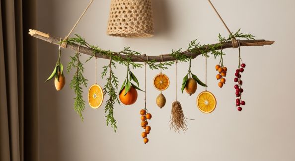 - Suspendez le tout à une grande branche ramassée dans la nature ou à une couronne en fil de fer, à l’aide de rubans ou ficelles.