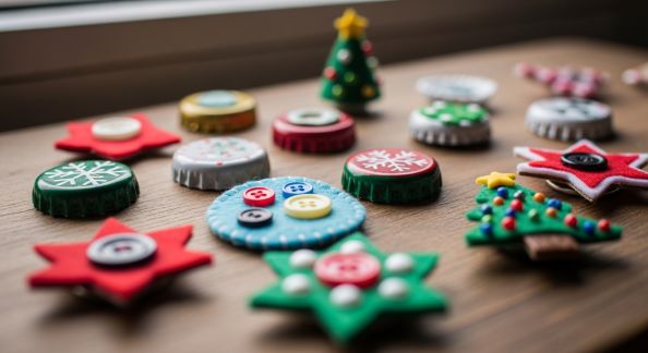 - Éléments créatifs : Boules de Noël abîmées, mini-jouets cassés, figurines, perles, étoiles découpées dans du carton, pâte à sel.