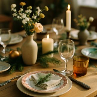 - Couronne centrale : Tressez des branches de sapin, d’eucalyptus ou de lierre et glissez-y des petites lampes micro-LED. La couronne devient centre de table vivant, à ajuster selon la longueur et la largeur du repas.