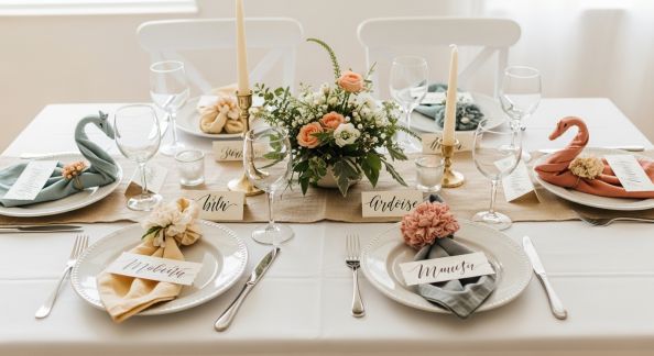 - Marque-places personnalisés : un rondin de bois, une étiquette kraft, ou un caillou peint, chacun avec le nom de l’invité écrit à la main.